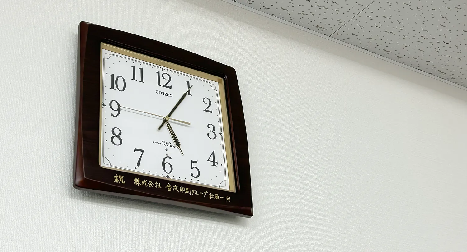 音成印刷創業120周年を記念して、社員一同から会社へ記念の掛け時計を贈りました。