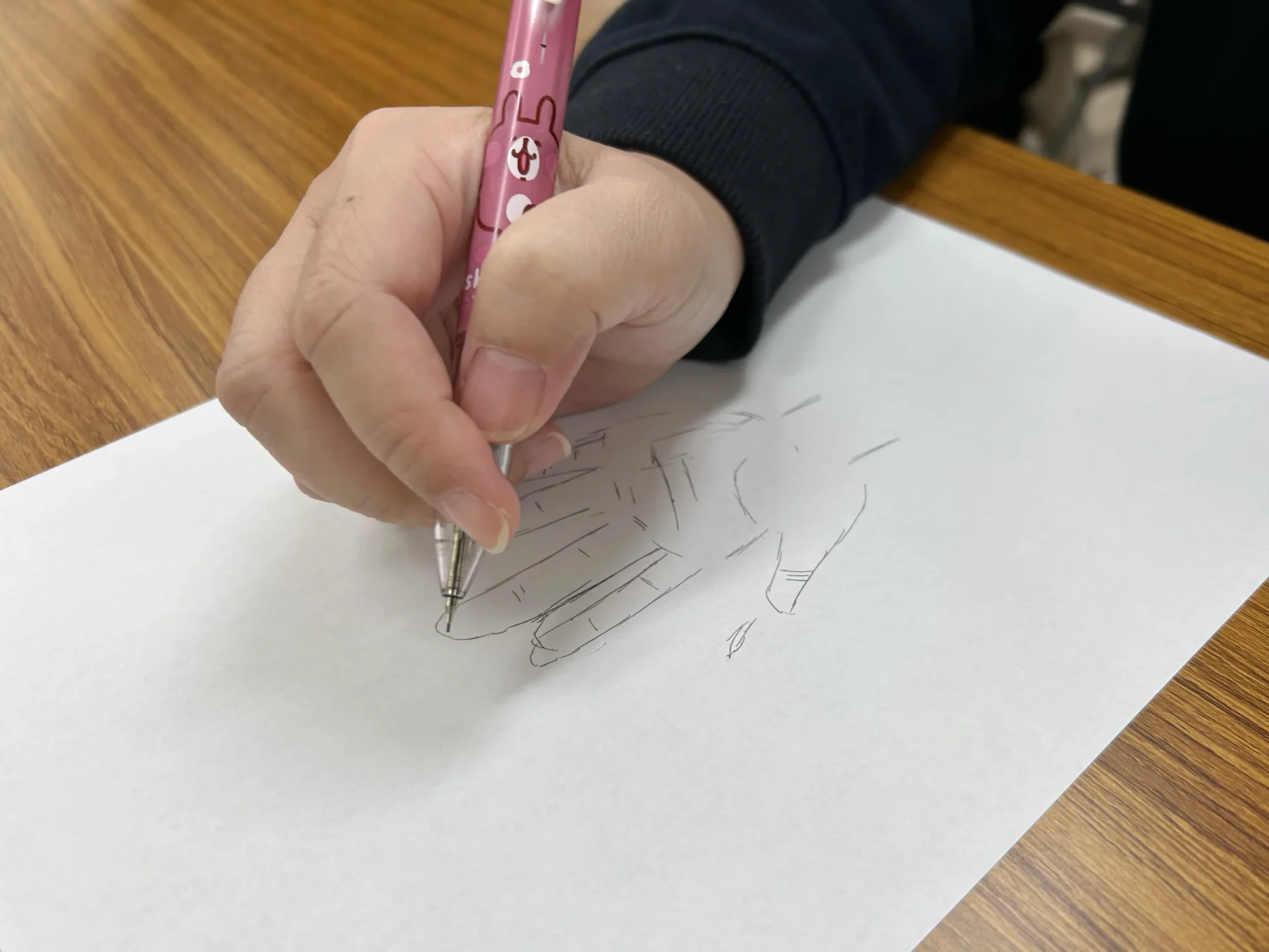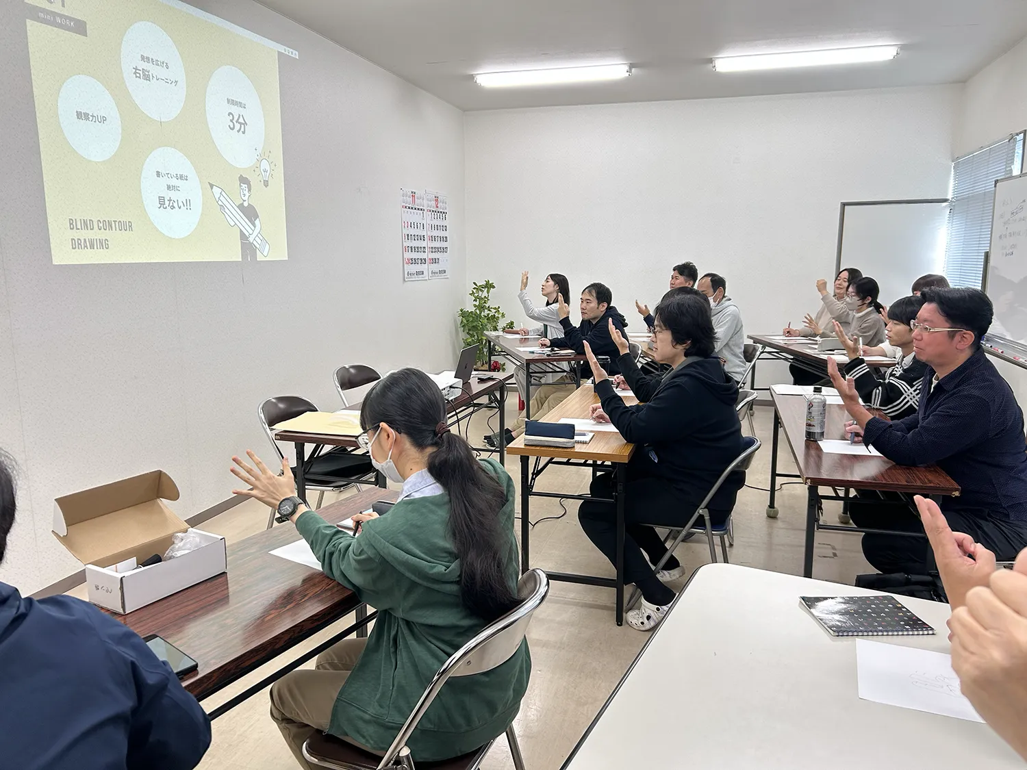 描くものを決めて紙を見ずに絵を描くというワーク。これが意外と難しいのですが、面白い作品がたくさん生まれました。観察眼や空間力が広がり右脳がどんどん刺激されます。今回は自分の手をテーマに描いていきました。